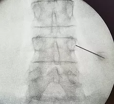 На рентгене справа показано положение иглы в области медиальной ветви, иннервирующей межпозвонковый сустав.