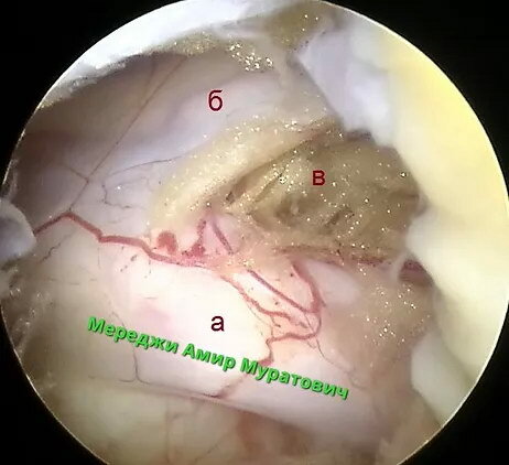 На фото показан операционный вид через камеру спинального эндоскопа. Спинномозговой корешок лежит свободно (а). При этом вся область операционной раны всего несколько миллиметров. Как показано определяется прекрасная визуализация нервных структур и возможность контроля хирургических действий. Следует обратить внимание на полное отсутствие признаков кровотечения.