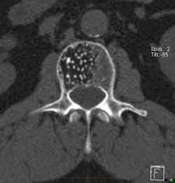 Компьютерная томография является основным методом диагностики диагностики гемангиом позвонков. Она позволяет определить размеры, распространенность, выраженность изменений костной ткани, провести дифференциальную диагностику гемангиом. Главным рентгенологическим признаком гемангиом является специфическая перестройка губчатого вещества тела позвонка, заключающаяся в сочетании частичного лизиса костной ткани с гипертрофией сохранившихся костных трабекул. На аксиальных срезах тело позвонка напоминает "пчелиные соты".