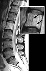 Магнитно-резонансная томография высоко информативна в отношении гемангиом позвонков и рассматриватся как вспомогательный метод диагностики. Типичная МР-картина гемангиом позвонков характеризуется неоднородным сигналом на Т1- и Т2-взвешенных изображениях (ВИ). Этот паттерн представлен множественными зонами как высокого, так и низкого по интенсивности сигнала, что вызывает картину «испещрённости». При этом области низкого или изоинтенсивного сигнала как на Т1 так и Т2 ВИ соответствуют костные трабекулы, а иногда сосудистые полости («симптом пустоты потока»). Гиперинтенсивный сигнал в Т1 и Т2 ВИ присущ жировой ткани. Количество жира в структуре гемангиомы обратно пропорционально степени её опухолевой активности. Гемангиомы с высоким содержанием жировой ткани чаще бессимптомны и не характеризуются активным ростом. Округлые или бесформенные, различных размеров жировые включения в телах позвонков, не имеющие симптома «испещрённости» - не являются истинными гемангиомами и должны описываться как очаги липоангиоматоза. Липоангиоматозные образования, относятся к дегенеративной патологии позвоночника, являются следствием адипозной инволюции красного костного мозга и не имеют клинического значения. Очаги липоангиоматоза почти всегда небольших размеров, визуализируются сразу во многих позвонках, могут быть множественными в пределах одного тела позвонка, склонны к слиянию и не имеют специфичных для гемангиом рентгенологических симптомов. Для гемангиом характеризующихся активным ростом, выраженными клиническими проявлениями характерен неоднородный изо-гипоинтенсивный сигнал в Т1 ВИ и 7 гиперинтенсивный сигнал в Т2 ВИ (сигнал жидкости). При этом в режиме жироподавления отмечается резкое увеличение интенсивности сигнала от гемангиомы.